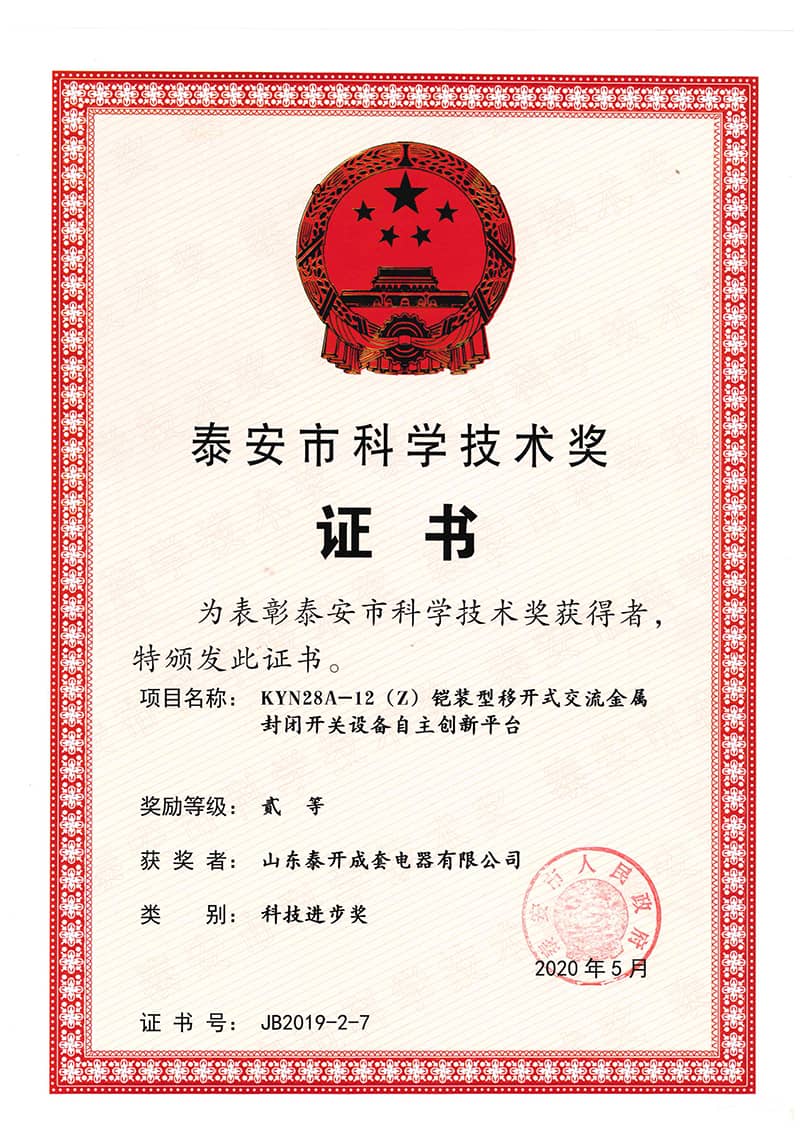 泰安市科技進步二等獎KYN28自主創(chuàng)新平臺-2020